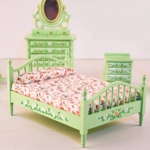 Cama Em Miniatura Casa De Boneca De Madeira Quarto Dollhouse Móveis Em Miniatura Cama Padrão De Flor Escala 1:12